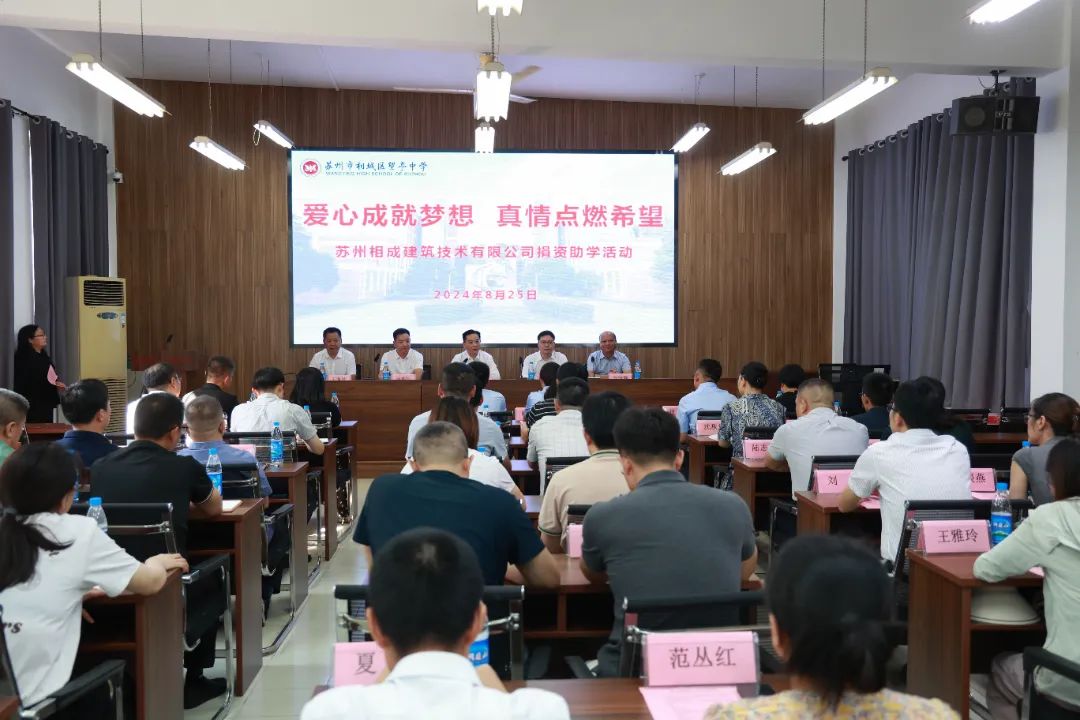 8月25日下午,苏州相成建筑技术有限公司捐资助学活动在望亭中学会议室3举行,相城区人民政府副区长朱向峰、望亭镇党委书记王丰、苏州相成建筑技术有限公司总经理徐伟伟、望亭中学党总支书记徐晓峰及望亭中学校长王海卿参加本次活动。