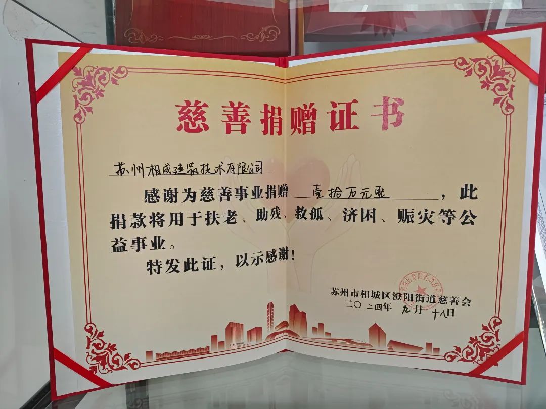 汇小爱聚大爱,为进一步弘扬中华民族扶贫济困的传统美德,9 月 18 日,苏州相成建筑技术有限公司于苏州相城区澄阳街道慈善会捐款十万元,用于扶老、助残、救孤、济困、赈灾等公益事业。此次捐款活动,充分彰显了苏州相成建筑技术有限公司的社会责任与担当。