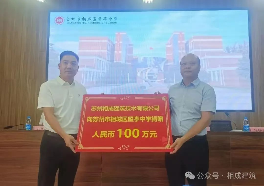 捐资助学,惠泽千秋。2024 年 8 月,苏州相成建筑技术有限公司对望亭中学捐资助学 100 万,用于学校文汇堂的修建。工程的预算、设计、建造以及装修等相关事宜均由苏州相成建筑技术有限公司承担。苏州相成建筑技术有限公司总经理徐伟伟先生高风亮节、不忘初心,践行企业社会责任,热心社会公益事业。这不仅展现了爱心企业重教兴学的教育情怀,更彰显了优秀企业家的社会担当,为弘扬乐善好施、尊师重教的传统美德树立了典范。捐资助学传爱心,尊师重教留美名。学校将文汇堂的艺术中心命名为“伟远”,以感谢徐伟伟先生的博爱之心、奉献之举,激励望中学子成为大爱无垠的传递者和乐善不止的助力者,并且能够树立远大理想,志存高远,在艺术文化的殿堂里,绽放绚丽光芒!